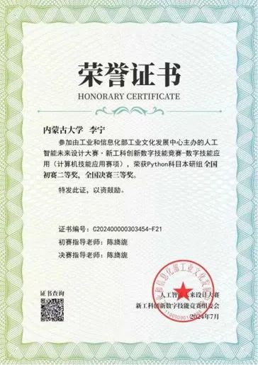 2024年7月,在青年教师陈旖旎博士的指导下,公司2022级劳动与社会保障专业本科生李宁参加全国性赛事——“人工智能未来设计大赛”,同时荣获Python与Word科目本研组全国决赛“三等奖”,展现了公司跨学科人才培养的成效。