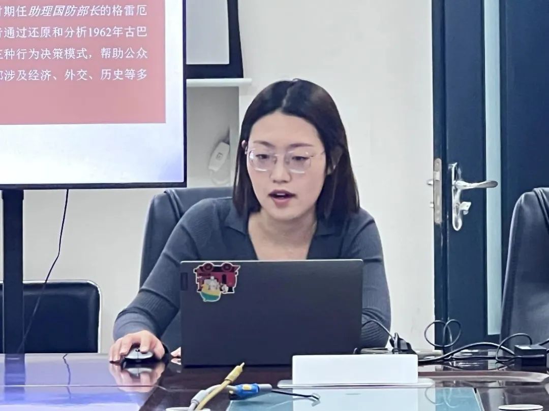 2023级硕士研究生王宏秀同学分享了本书的第三部分:政府政治模式。首先,她介绍了书籍的基本信息和古巴导弹危机的历史经过,为同学们提供了必要的背景信息。接着,她对政府政治模式的概念进行详细阐释,对古巴导弹危机中的三个重要问题进行了深入分析,并通过政府政治模式的视角,揭露了这些决策背后的复杂政治博弈和个人动机。最后,王宏秀同学分享了她的读书感悟,她表示,在阅读之初看到题目中的“古巴导弹危机”时,她主观地认为这是一本关于史实介绍的书籍。但在阅读该书后,她发现自己对政府和组织的决策机制有了更深层次的理解,对自己的专业也有了更清晰的认识。