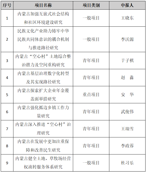 在内蒙古自治区哲学社会科学规划项目《国务院关于推动内蒙古高质量发展奋力书写中国式现代化新篇章的意见》研究专项课题中,共获批5项,分别为安华教授申报的《内蒙古探索扩大企业年金覆盖面举措研究》、武俊伟特聘研究员申报的《内蒙古强化抵边乡镇工作力量研究》、王瑞雪老师申报的《内蒙古深入推进“空心村”治理研究》、李政蓉老师申报的《内蒙古在发展中更加注重保障和改善民生研究》和杜习乐老师申报的《内蒙古健全土地、草牧场经营权流转服务体系研究》。