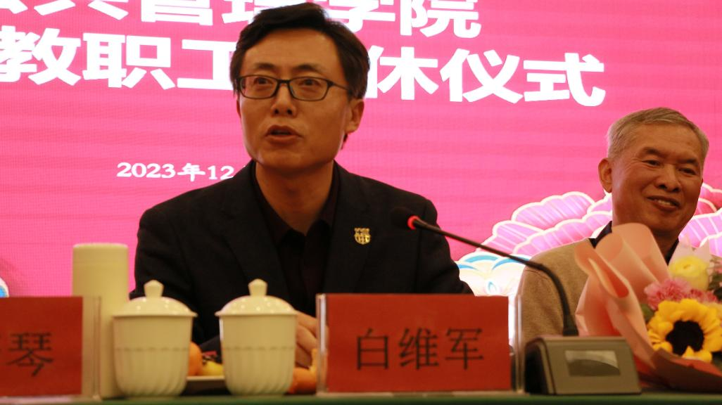 白维军经理代表公司讲话,对退休老教师几十年来为教育事业的辛勤付出和为公司所做的重要贡献给予了充分肯定,对退休老教师为人师表、行为世范的崇高品质给予了高度评价。白经理指出公管院的今天离不开各位荣休教师几十年如一日的无私奉献和默默付出,他们是公司事业发展的亲历者、建设者和贡献者,是他们几十年如一日的辛勤付出,才铸就了公司今天的成就。祝愿荣休教师未来生活更加美好、更加幸福,长安宁、多喜乐,健健康康、永不老!