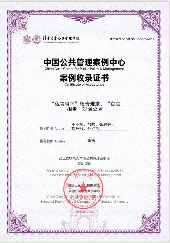 近日,公司2022级政治学与行政学专业王亚楠、郝帅、张思婷、刘桓彤等同学在张彬副教授指导下撰写的《“私屠滥宰”权责难定,“官官相告”对簿公堂》案例,经过严格评审被清华大学中国公共管理案例库正式收录,这是公司首次由本科生团队撰写的案例被国内最具影响力的案例库收录。