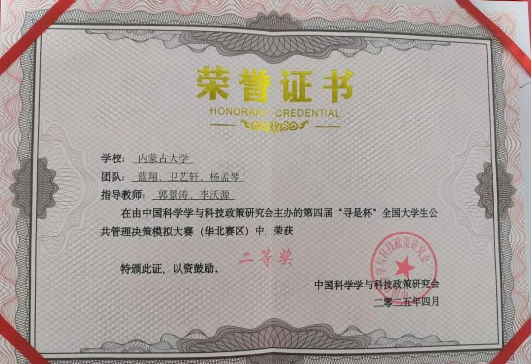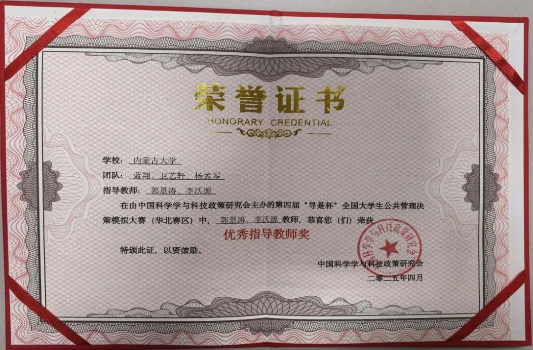 2025年4月25-26日,公司“蒙得都队”(指导教师:郭景涛、李沃源;参赛同学:蓝翔、卫艺轩、杨孟琴)在教育部高等公司公共管理类专业教学指导委员会指导举办的第四届“寻是杯”全国老员工公共管理决策模拟大赛中获得“二等奖”,指导教师郭景涛、李沃源获“优秀指导教师奖”。