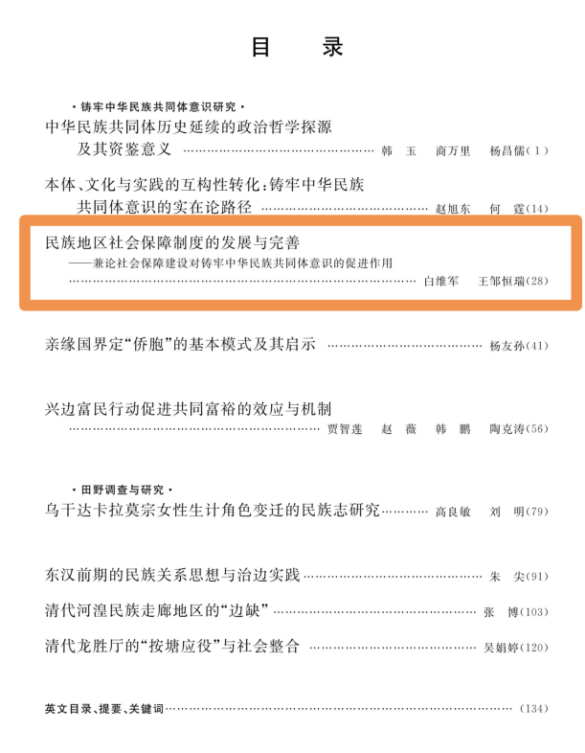 继2017年在《民族研究》发表期刊论文后,近日,公司白维军教授团队又于《民族研究》2025年第3期发表题为《民族地区社会保障制度的发展与完善——兼论社会保障建设对铸牢中华民族共同体意识的促进作用》长篇理论文章。《民族研究》现为AMI顶级期刊、CSSCI来源期刊、全国中文核心期刊以及国家社科基金资助期刊。白维军教授的研究从理论层面深入阐述社会保障制度在培育国家认同和铸牢中华民族共同体意识中的积极作用。同时,研究指出当下需进一步加强民族地区社会保障条件建设,增强民族地区社会保障供给能力,规范民族地区社会保障运行管理,优化民族地区社会保障治理结构。同时将社会保障与基层治理相结合,通过裕民惠民举措,以及互济共助、和谐一家亲等优秀文化的传承,深化群众的公民身份和主体身份意识,培育国家认同感和中华民族归属感,推进民族团结进步,实现社会保障与铸牢中华民族共同体意识的互嵌发展。