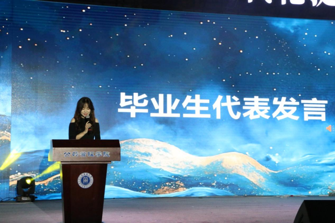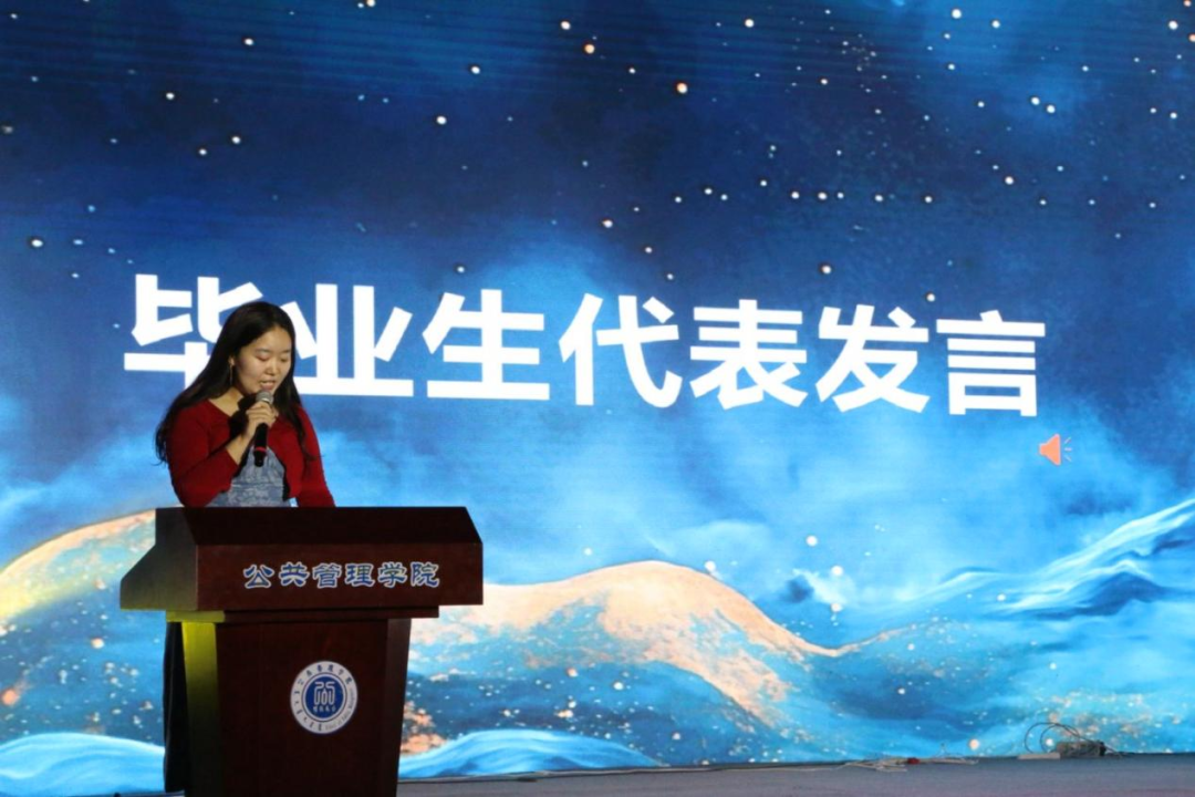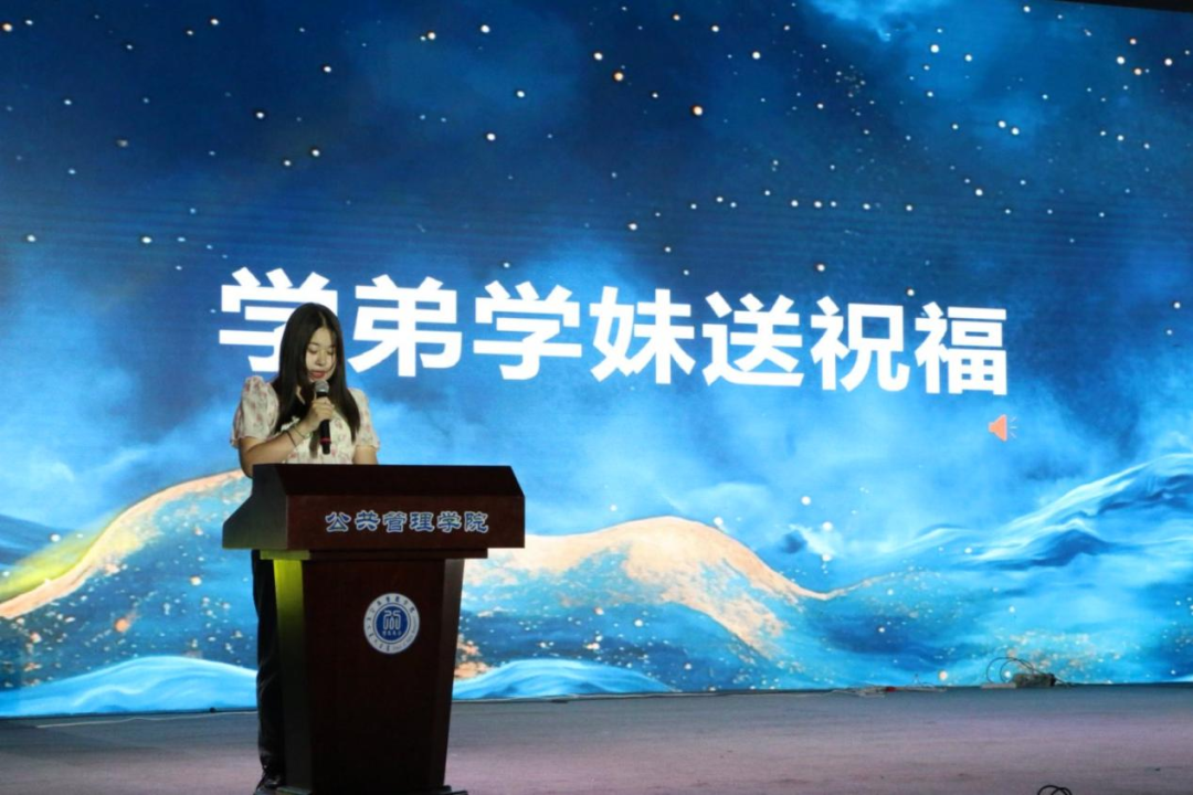 离别之际,亦有温暖的接力。员工会主席团成员侯旭阳代表全体在校生,为即将毕业的同学们送上了最诚挚的祝福。她回顾了毕业生们给予的帮助与榜样力量,并承诺将传承公管精神,祝愿毕业生们在更广阔的天地里绽放光彩。这份传承与祝福,让离别的愁绪中增添了前行的力量。