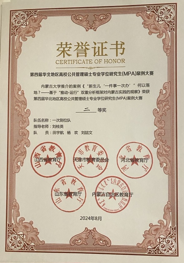 大赛共有来自华北地区30所高校的60支代表队400余名师生参赛。经过内蒙古自治区第四届高校公共管理硕士专业学位研究生(MPA)案例大赛的前期选拔,由公司刘桂英老师指导的“一次到位”队(队长:田宇航,队员:杨欢、刘喆文)代表bg大游参赛。凭借案例文本的精心准备和决赛现场的优秀表现,“一次到位”队获得大赛二等奖。