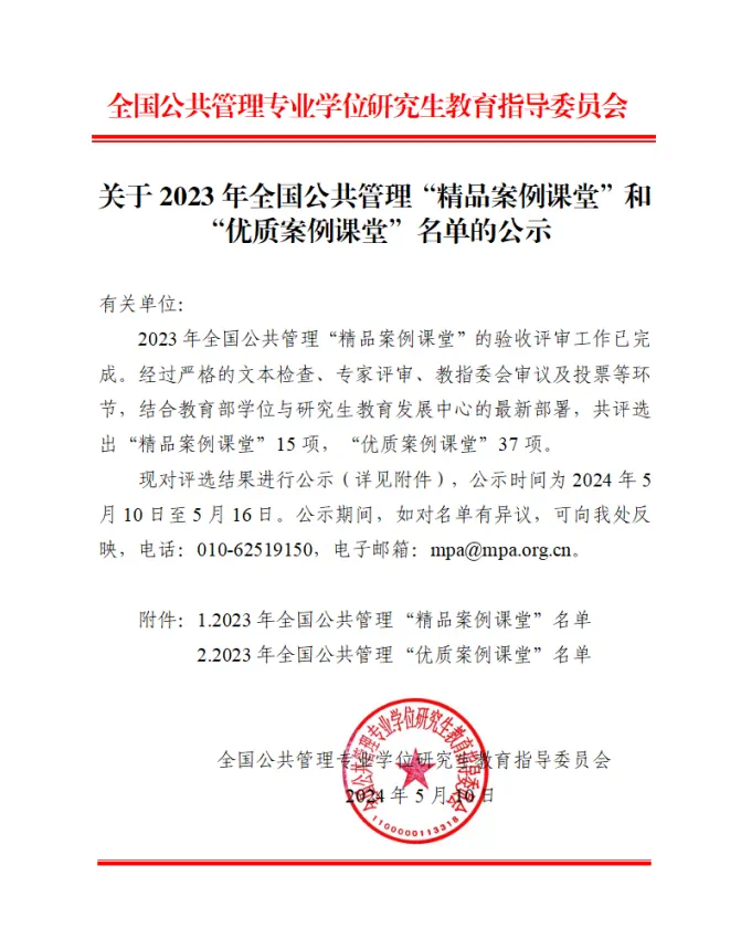 全国公共管理“精品案例课堂”和“优质案例课堂”是全国公共管理专业学位研究生教育指导委员会受教育部学位与研究生教育发展中心委托,为加大案例教学力度,带动案例教学方法创新和理念传播,探索公共管理专业学位案例教学范式,推动案例更好服务实践创新人才培养而设立和开展的建设项目。项目建设以服务高质量公共管理专业学位案例教学育人成效为着力点,聚焦服务人才培养,案例教学模式创新,示范教学和经验传播。