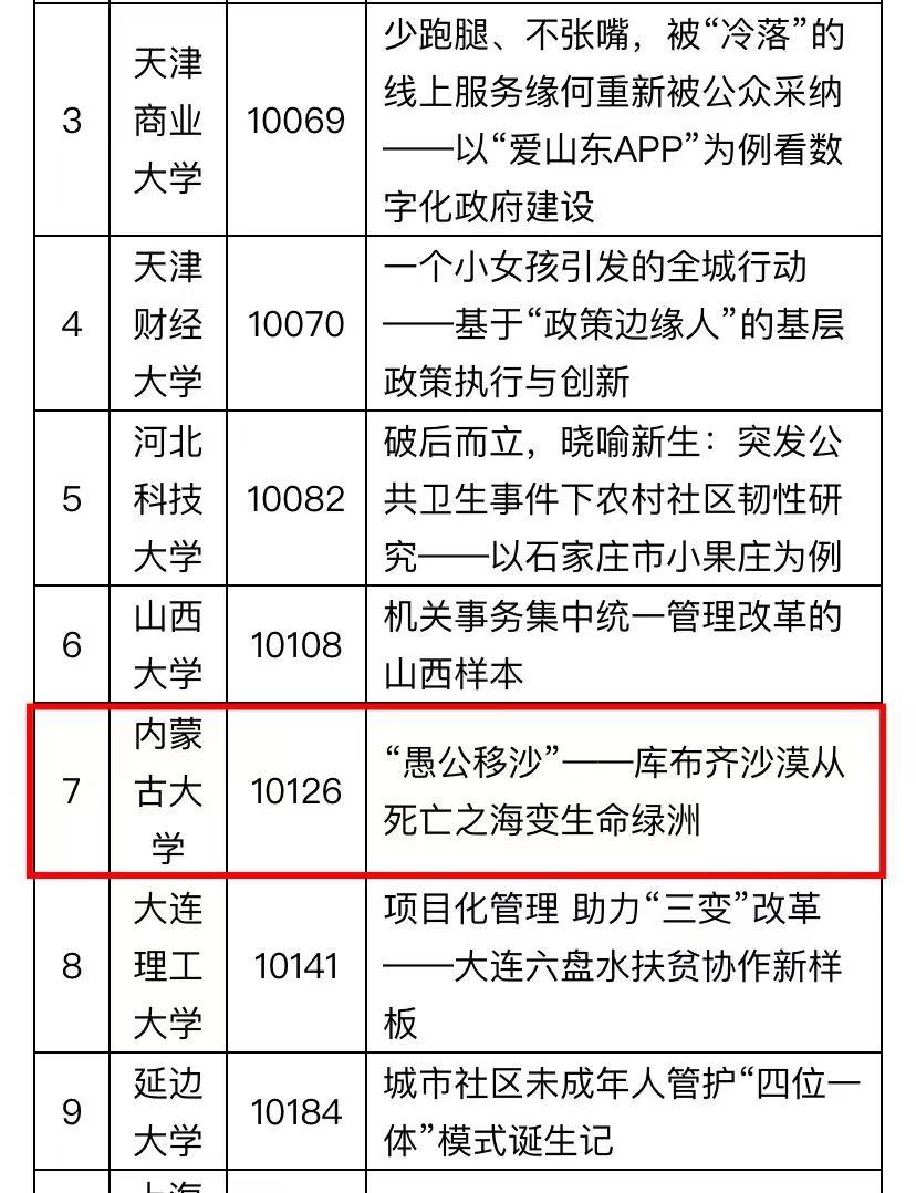 近日,全国公共管理专业学位研究生(MPA)教育指导委员会发布了2023年全国公共管理“精品案例课堂”和“优质案例课堂”名单。经过严格的文本检查、专家评审、教指委会审议及投票等环节,共选出“精品案例课堂”15项,“优质案例课堂”37项。公司李沃源副教授申报的《“愚公移沙”—库布齐沙漠从死亡之海变生命绿洲》入选“优质案例课堂”名单。