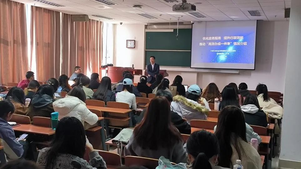 3月12日,在公司《电子政务》课程教学中,郭景涛副教授邀请内蒙古自治区政务服务与数据管理局政务服务处副处长孙健走进课堂,为2022级行政管理专业、2022级劳动与社会保障专业本科生讲授“电子政务发展与实践创新”专题。孙健副处长长期从事政务服务平台建设与改革工作,主导推进自治区“一网通办”等重点项目,参与制定多项数字化政务服务标准,其牵头的“高效办成一件事”改革案例获评全国政务服务创新示范项目。本次课程以电...